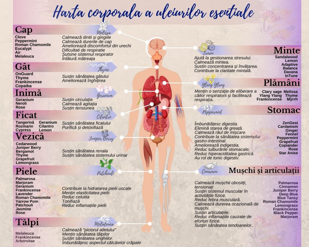 Stim deja că uleiurile esențiale sunt versatile și ne pot susține întregul corp. Totuși unele dintre ele sunt mai potente pentru anumite părți, organe sau sisteme ale corpului. Am pregătit o mini-hartă cu acțiunea unor uleiuri esențiale pe părți specifice ale organismului. Acestea nu sunt nici pe departe toate uleiurile, dar cred că vă va fi utilă această sugestie. Uleiurile esențiale au diferite modalități de folosire.